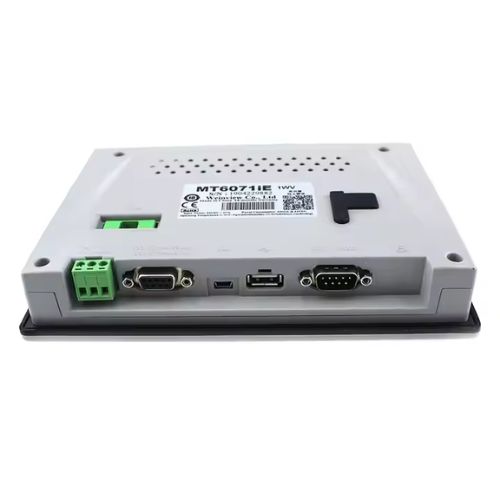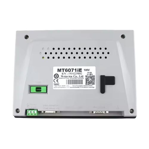The Weintek MT6071iE is a high-performance 7-inch HMI (Human Machine Interface) designed for industrial automation applications. Featuring a TFT LCD display with a resolution of 800×480 pixels and 65K colors, it ensures clear and vivid visualization for process monitoring. Equipped with a powerful 32-bit RISC processor and 128 MB of flash memory, the MT6071iE provides fast and reliable operation for controlling and monitoring PLCs and other industrial equipment. Its compact and robust design, combined with a user-friendly interface, makes it ideal for applications in manufacturing, packaging, food processing, and other automated industries. With support for multiple communication protocols, including Modbus and Ethernet, it offers seamless integration with various automation systems.